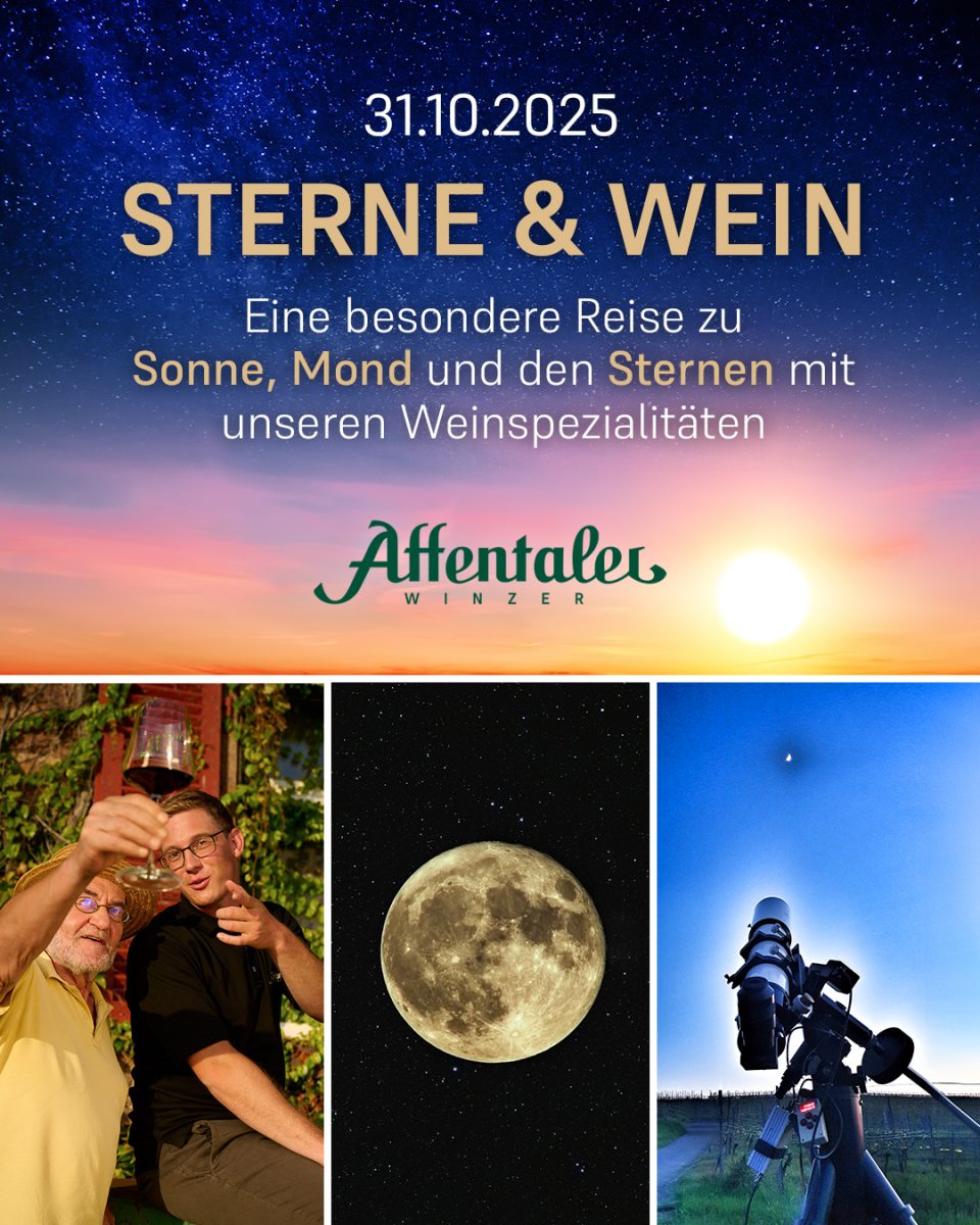 Am 31. Oktober 2025 laden wir euch zu einem besonderen Erlebnis ein: Gemeinsam mit dem Bühler Sterngucker e.V. entdecken wir die Faszination von Sonne, Mond und Sternen, begleitet von einer erlesenen Auswahl an Affentaler Weinspezialitäten.